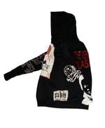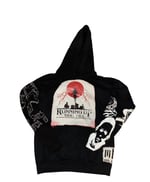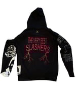 Hoodie in photo description: A one-of-one hoodie made from three upcycled shirts, stitched together into a horror-inspired masterpiece. Featuring bold “Running Up That Hill” front graphics, slash-style sleeve patches, and The Very Best Slashers stitched across the back. A true collector’s piece for lovers of one-of-ones and Halloween culture.